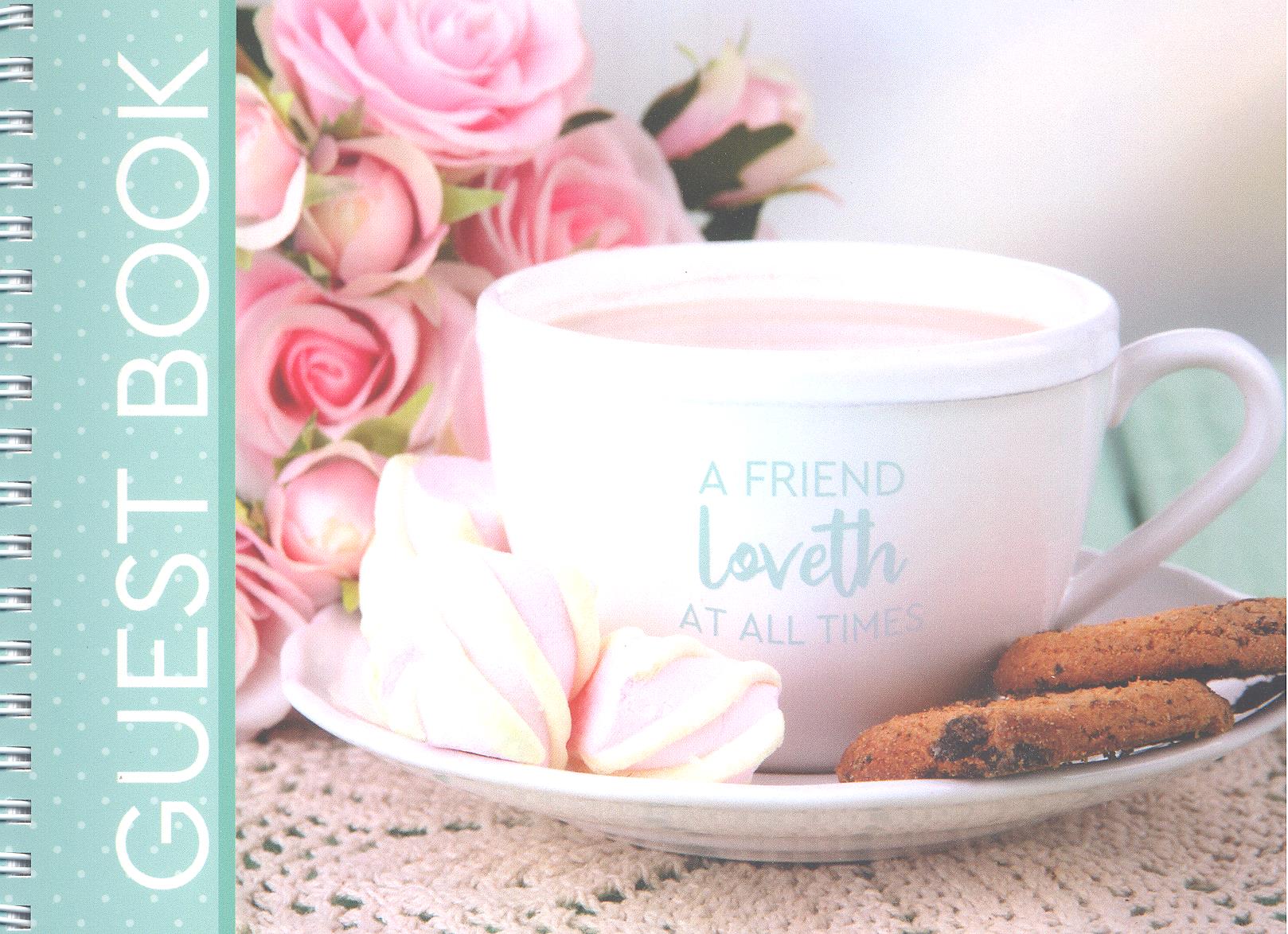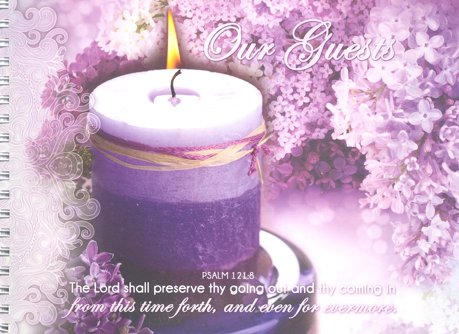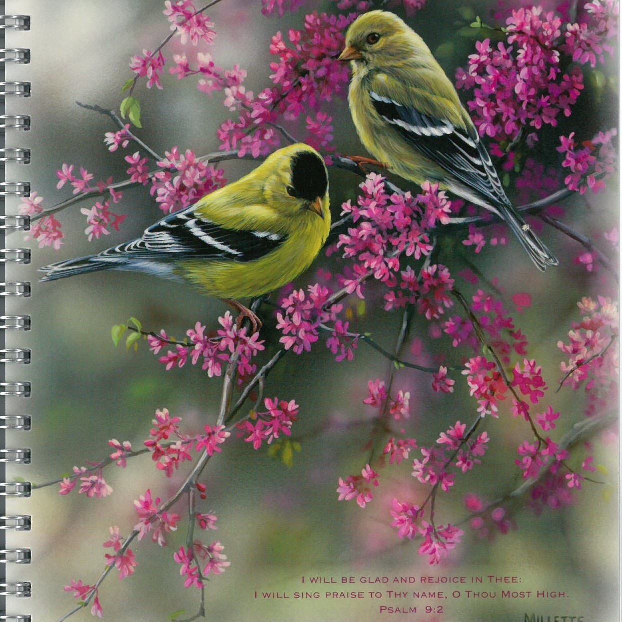 Faith View Creations. Light pink background, dark pink circle with white leaves on front cover, and copper wire-binding. 60 lined sheets for writing on both sides. Page size is 8 x 6 1/4 in.