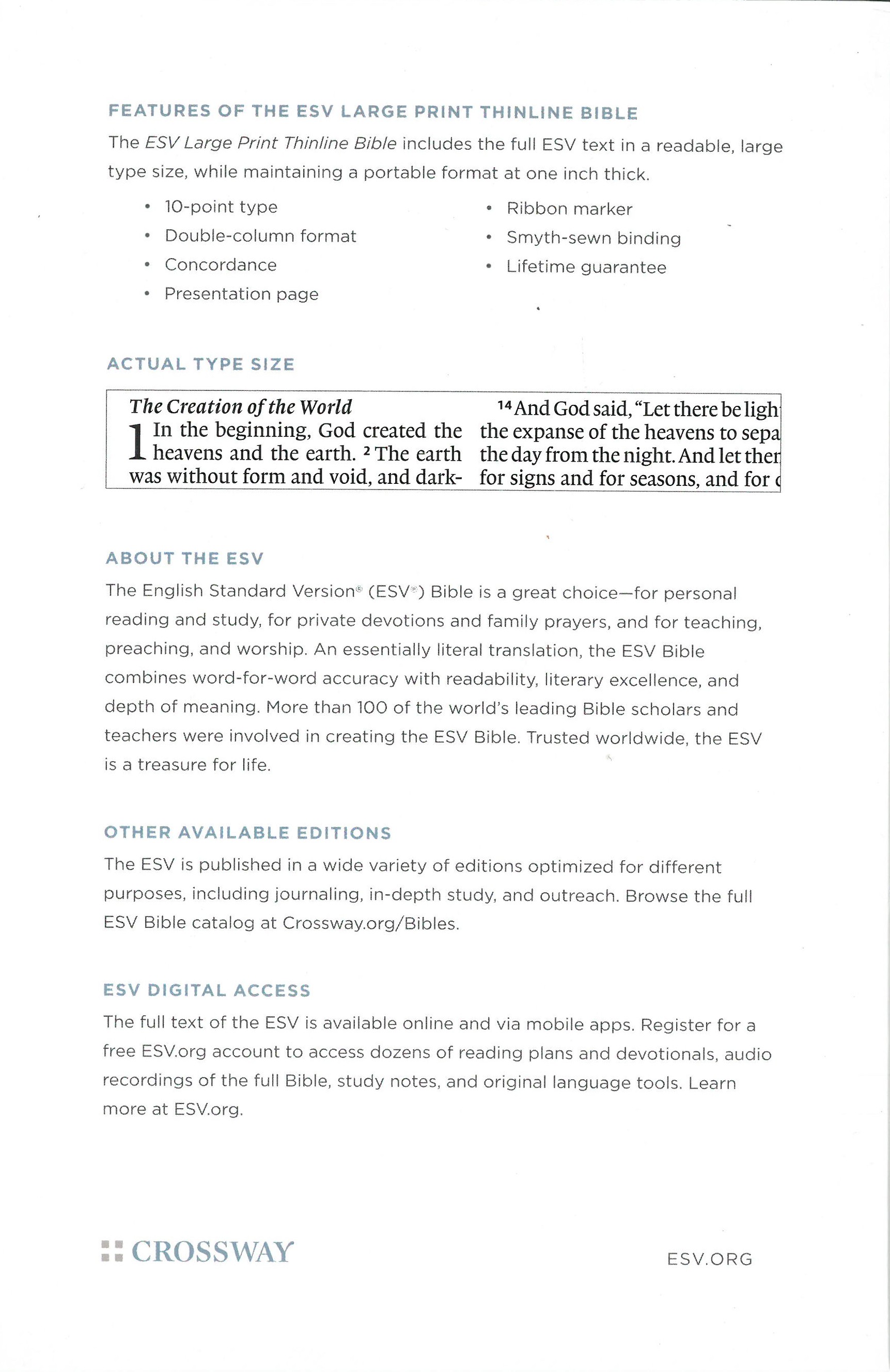 The ESV translation is great for personal study. An essentially literal translation, the ESV preserves much of the poetic and literary quality of the KJV while using modern English. Black letter only, paragraph style text, 10 point type, maps, subject headings throughout text. This Bible contains a limited concordance. Mahogany imitation leather cover. Page size is 8 3/8 in. by 5 3/8 in. Thickness is 1 inch.