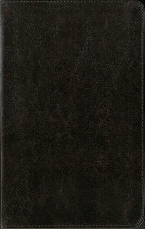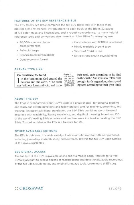 The ESV translation is great for personal study. An essentially literal translation, the ESV preserves much of the poetic and literary quality of the KJV while using modern English. Words of Christ in red, paragraph style text, cross references, book introductions, topical headings, maps, concordance, 9-point type. Dark brown imitation leather cover. Page size is 8 3/8 by 5 1/4 in. Thickness is 1 1/4 in.