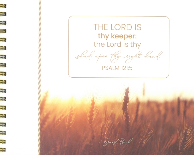 Faith View Creations. A wheat field on an off-white background, with copper wire-binding. 60 lined sheets for writing on both sides. Page size is 8 x 6 1/4 in.