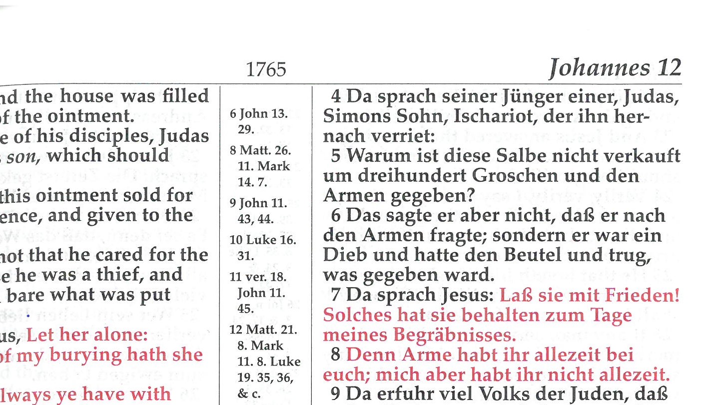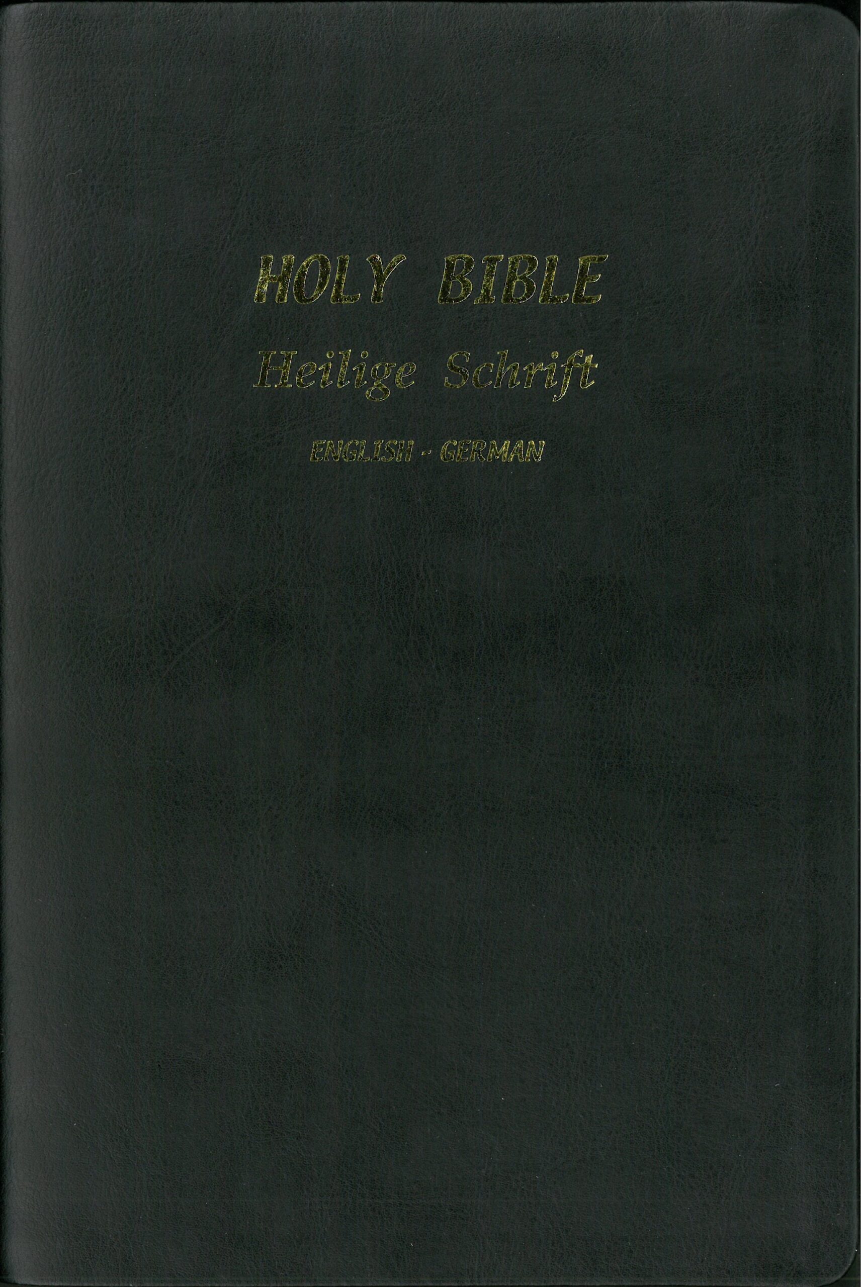 A parallel Bible in English and German. The Authorized King James 1611 is on the left page and German Martin Luther Stuttgart 1912 is on the right page. The German text is in modern script. Center references, ribbon marker, words of Christ in red. Includes an English concordance as well as Bible maps and helps section. Leather, with thumb-index. Some incorrect page headers; see page 1998 for example. Page size is 6 3/4 x 10; thickness is 2 in. Abana Books.