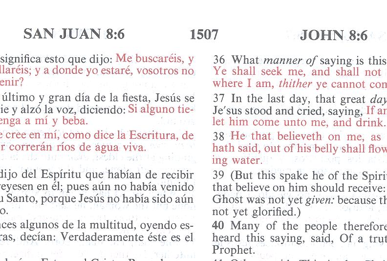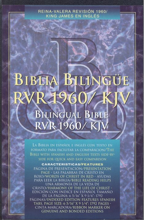 Complete texts of 1960 Reina-Valera Spanish Bible and King James Version English Bibles side by side. Words of Christ in red. Thumb index. Page size is 6 5/16 x 9 1/4 in.; thickness is 1 1/4 in. Black hardcover. Model number 0287.