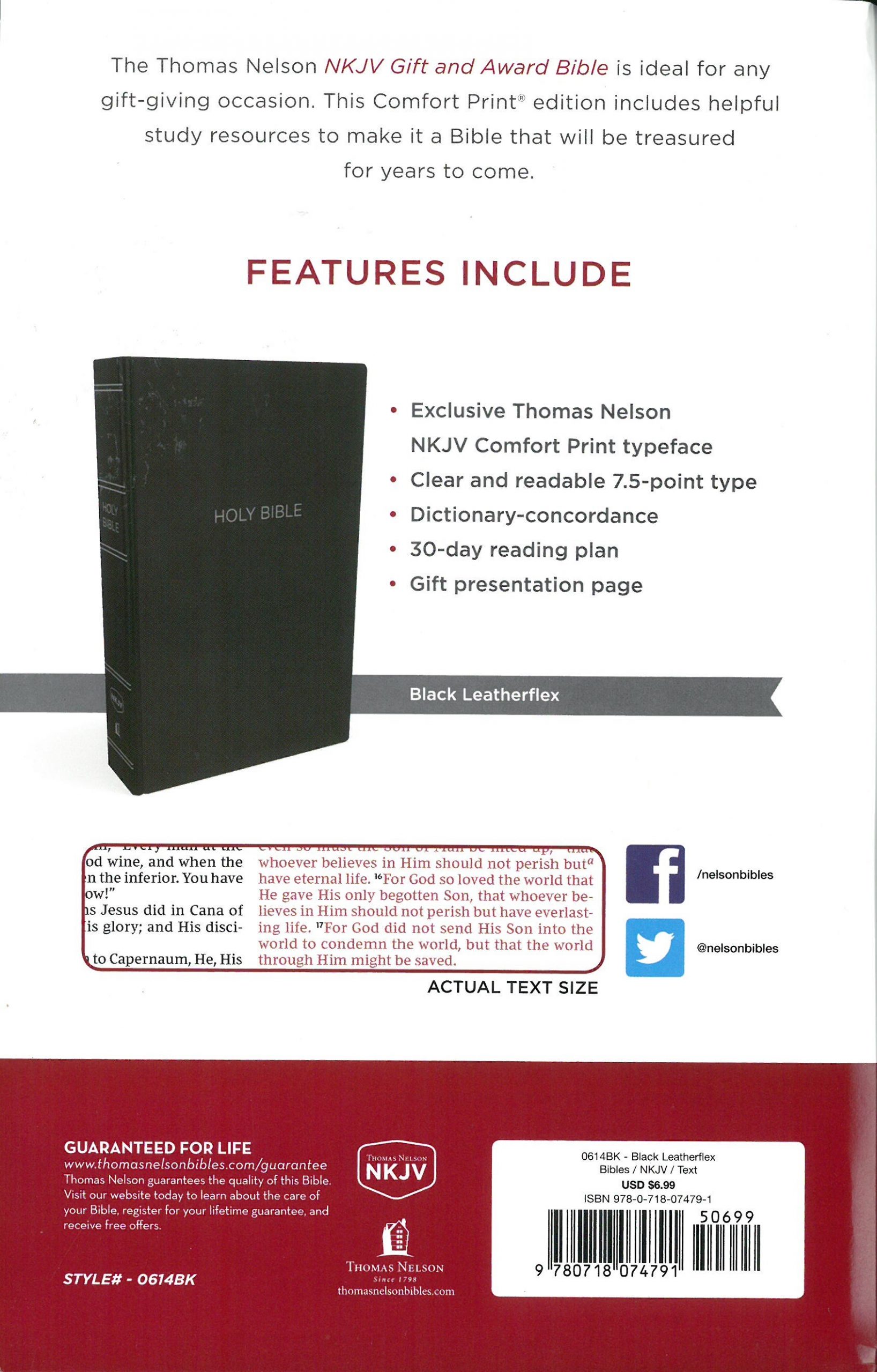 This version features careful efforts to preserve the King James text with more modern words where deemed necessary. Words of Christ in Red. Imitation leather binding. Nelson. Model number 0614BK.