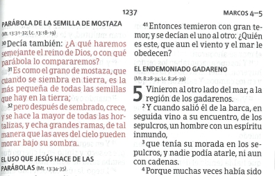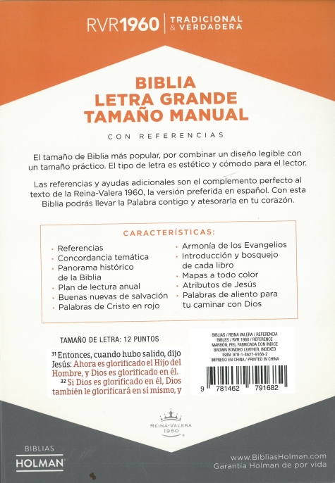 Holman, hand-size edition with concordance, words of Christ in red, end-of-verse references, thumb index, and more. Page size is 5 3/8 x 7 7/8 in.; thickness is 1 1/4 in. Brown, bonded leather. 1960 Reina-Valera edition.