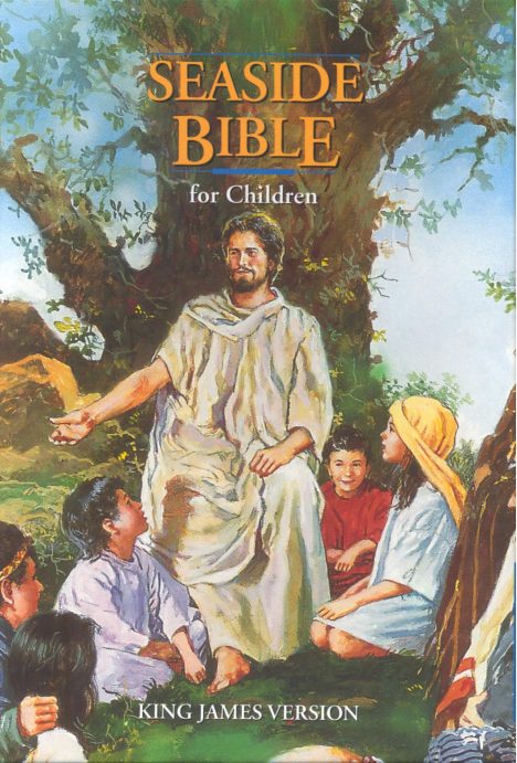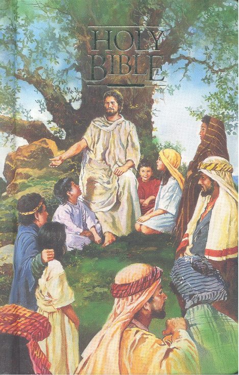 A children’s Bible featuring a full-color illustration on the cover, words of Christ in red, and fourteen color illustrations of important Bible events. Page size is 4 1/4 x 6 1/2 in.; thickness is 1 in. Hardcover. KJV.